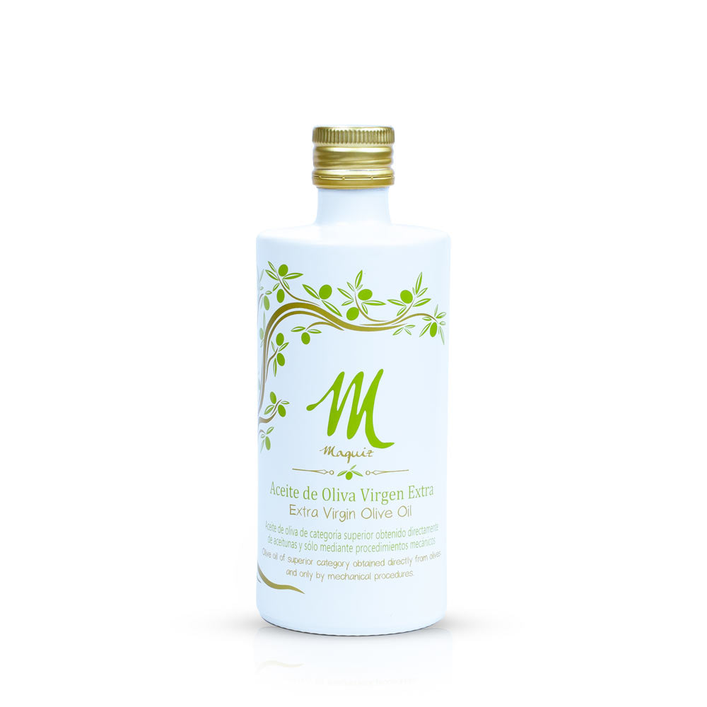 Arbequino: Fruity and sweet, with no bitterness and mild spiciness. The aromas of fresh and green olives stand out, along with fruity notes. It is very smooth on the palate, with a predominant taste of green apple, banana, and floral hints.